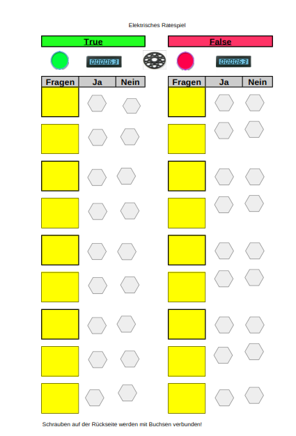 Dadurch, dass die Bananenstecker frei eingesteckt werden können, kann ein Ja-Feld entweder richtig, oder falsch sein. Das Gleiche gilt für das Nein-Feld. Wir können unser Spiel also "programmieren".