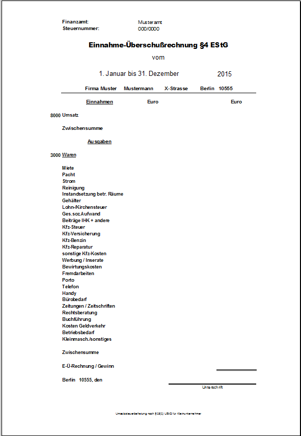 Das Bild zeigt eine komplete E-Ü/-Rechnung, fertig fürs Finanzamt,deren Stammdaten nur noch in die Tabelle „name“ eingetragen werden müssen.