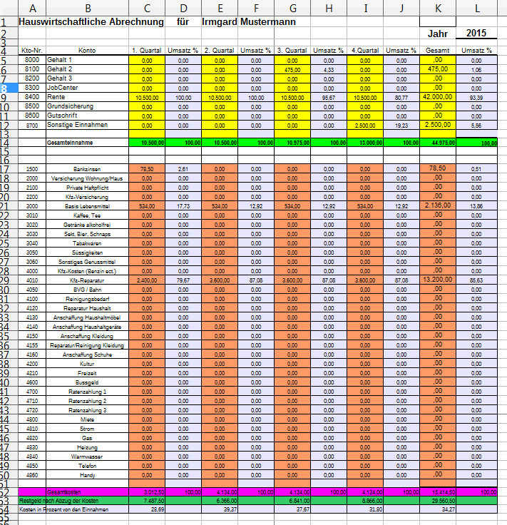 Das Herzstück einer Finanzbuchhaltung ist die Auswertung, die BWA. Auch unserem Haushaltsbuch habe ich so eine Auswertung spendiert, nenne sie allerdings HWA (Hauswirtschaftliche Auswertung). Der Aufbau unseres privaten Haushaltsbuches ist nun so komplex, dass Kleinfirmen damit durchaus ihre Buchhaltung und Abschlüsse machen könnten. Dazu müssten lediglich die Konten der Firma angepasst werden, was eine Minutensache wäre. Da ich schon mal dabei bin, habe ich zusätzlich für Selbständige und Freiberufler eine Einnahme-/Überschussrechnung erstellt und wichtige Stammdaten in die Tabelle „name“ integriert.