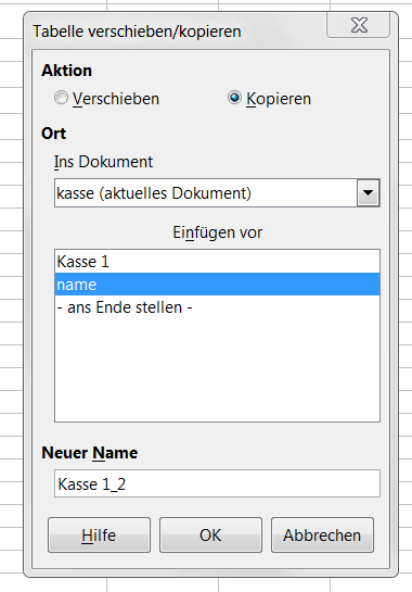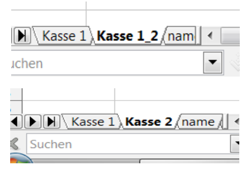 In das Menü Verschieben/Kopieren können wir unten auch gleich den neuen Namen der Tabelle eingeben, in diesem Fall „Kasse 2“ für den Februar. Auf die gleiche Weise kopieren wir weiter die Tabelle Kasse, bis wir beim Dezember = „Kasse 12“ angekommen sind.