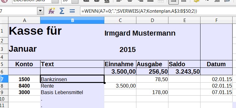 Diese Formel definiert in der Tabelle „Kontenplan“ eine Matrix, die zwei Spalten umfasst. In diesem Fall prüft die Formel „Wenn“, ob etwas im Feld “Kasse A7“ steht. Steht dort nichts, dann erscheint im Textfeld ein Punkt. Steht dort eine Zahl, prüft „Sverweis“, ob sich diese Zahl in der Matrix befindet. Ist dies der Fall, dann gibt es aus Spalte „B“ (2) den betreffenden Text in das Textfeld „Kasse Text“ aus.