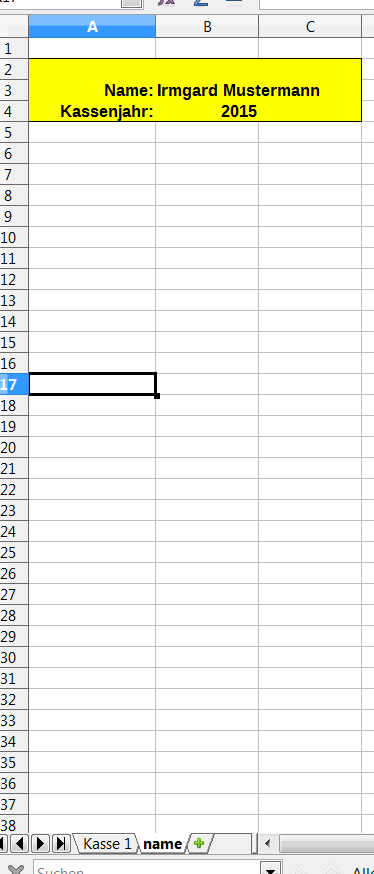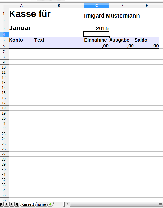 Wollen wir Namen und Jahr ändern, ist es eine langweilige Angelegenheit, in jeder Tabelle die Änderungen manuell vorzunehmen. Also generieren wir eine Tabelle „Name“. Hier kommt lediglich der Name und das Jahr hinein. Wenn wir wollen, können wir natürlich auch eine Adresse eingeben. Ins Feld der Kasse „C1“ kommt die Formel „=name.b3“, in „C3“ kommt „=name.b4“