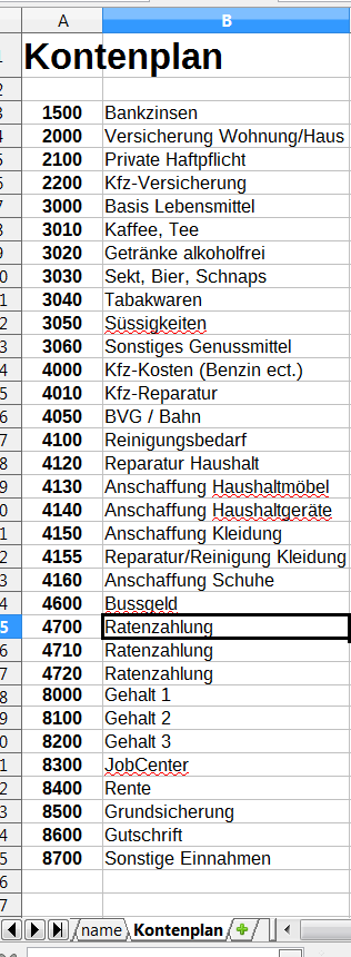 Da wir uns jetzt also darüber klar sind, was wir genau wollen, können wir loslegen. Dazu erstellen wir uns zuerst einen Kontenplan, wie er auch in Firmen verwendet wird, nur eben auf uns zugeschnitten. Er besteht aus zwei Spalten – die erste Spalte ist die Kontonummer, die zweite Spalte der Kontentext, beispielsweise 3000 = Grundnahrungsmittel. Natürlich könnten wir diese auch noch unterteilen, aber das würde hier zu weit führen.